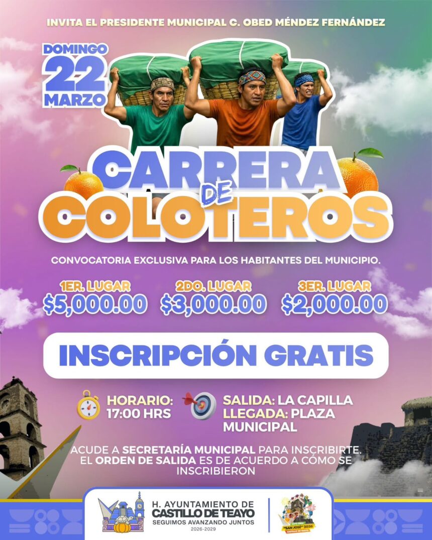 El H. Ayuntamiento de Castillo de Teayo, encabezado por el presidente municipal C. Obed Méndez Fernández, invita a la ciudadanía a participar en la tradicional Carrera de Coloteros 2026, una actividad que forma parte de las expresiones culturales y deportivas que distinguen al municipio, resaltando el orgullo por las raíces y las tradiciones ligadas al trabajo del campo.