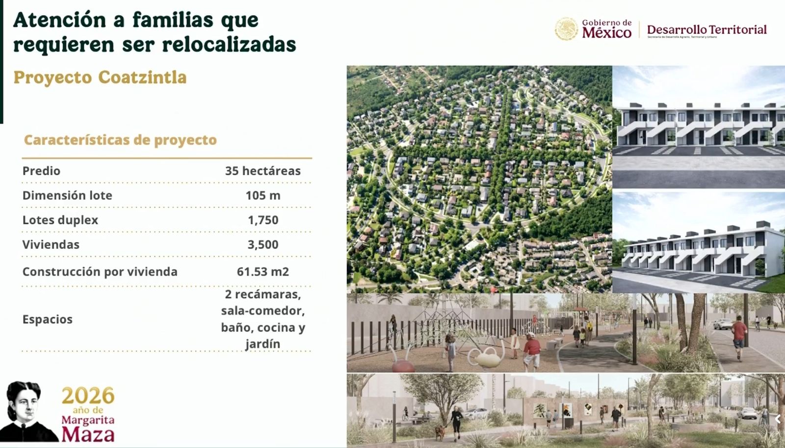 En la reubicación y dentro de la inversión que realizará el Gobierno Federal, el Proyecto Coatzintla contempla la construcción de 3,500 viviendas en un terreno de 35 hectáreas.