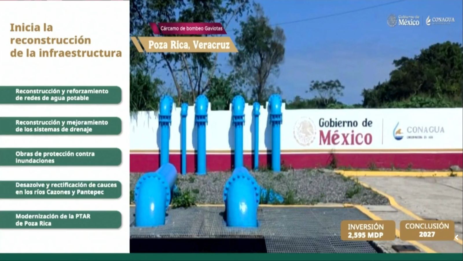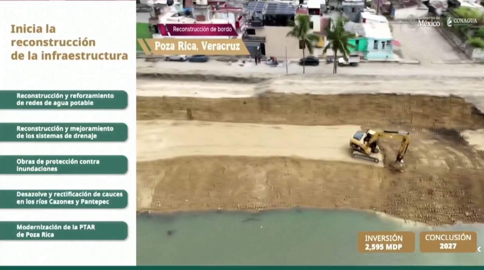 Durante su visita a Veracruz, la Presidenta de la República, Claudia Sheinbaum Pardo, destacó una inversión de 2 mil 595 millones de pesos para la zona norte, la mayor inversión será para Poza Rica, con obras como la reconstrucción y reforzamiento de redes de agua potable, reconstrucción y mejoramiento de los sistemas de drenaje, obras de protección contra inundaciones, desazolve y rectificación del cauce del río Cazones y modernización de la Planta Tratadora de Aguas Residuales de Poza Rica.