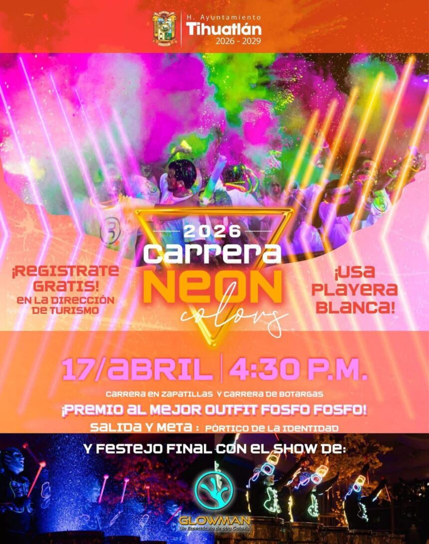 Tihuatlán, Ver. — Con el propósito de fomentar la convivencia, la activación física y el sentido de comunidad, el Gobierno Municipal de Tihuatlán, encabezado por el presidente municipal Raúl Hernández Gallardo, anunció la realización de la “Carrera Neón Color 2026”, un evento lleno de energía, color y diversión para todas las edades.