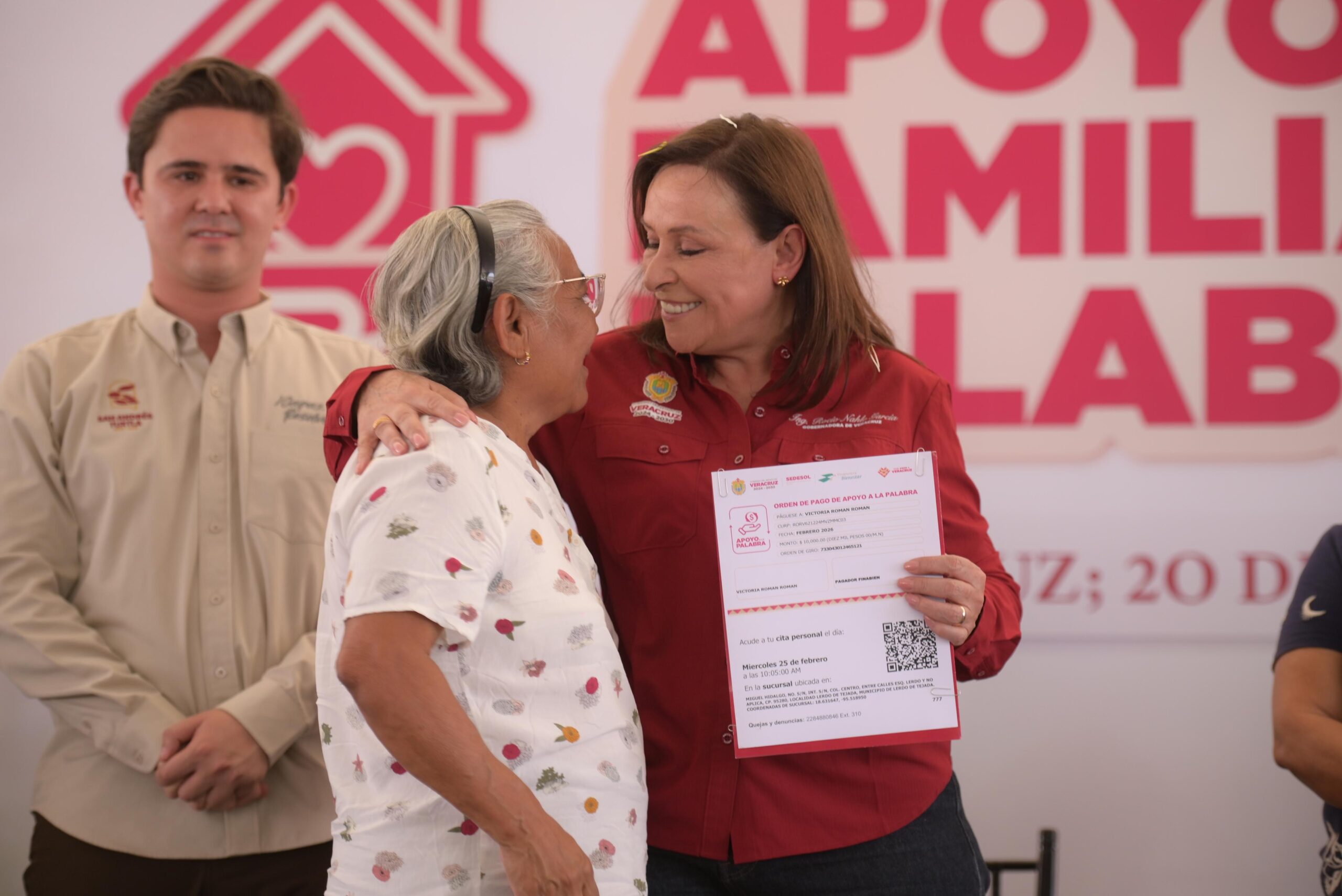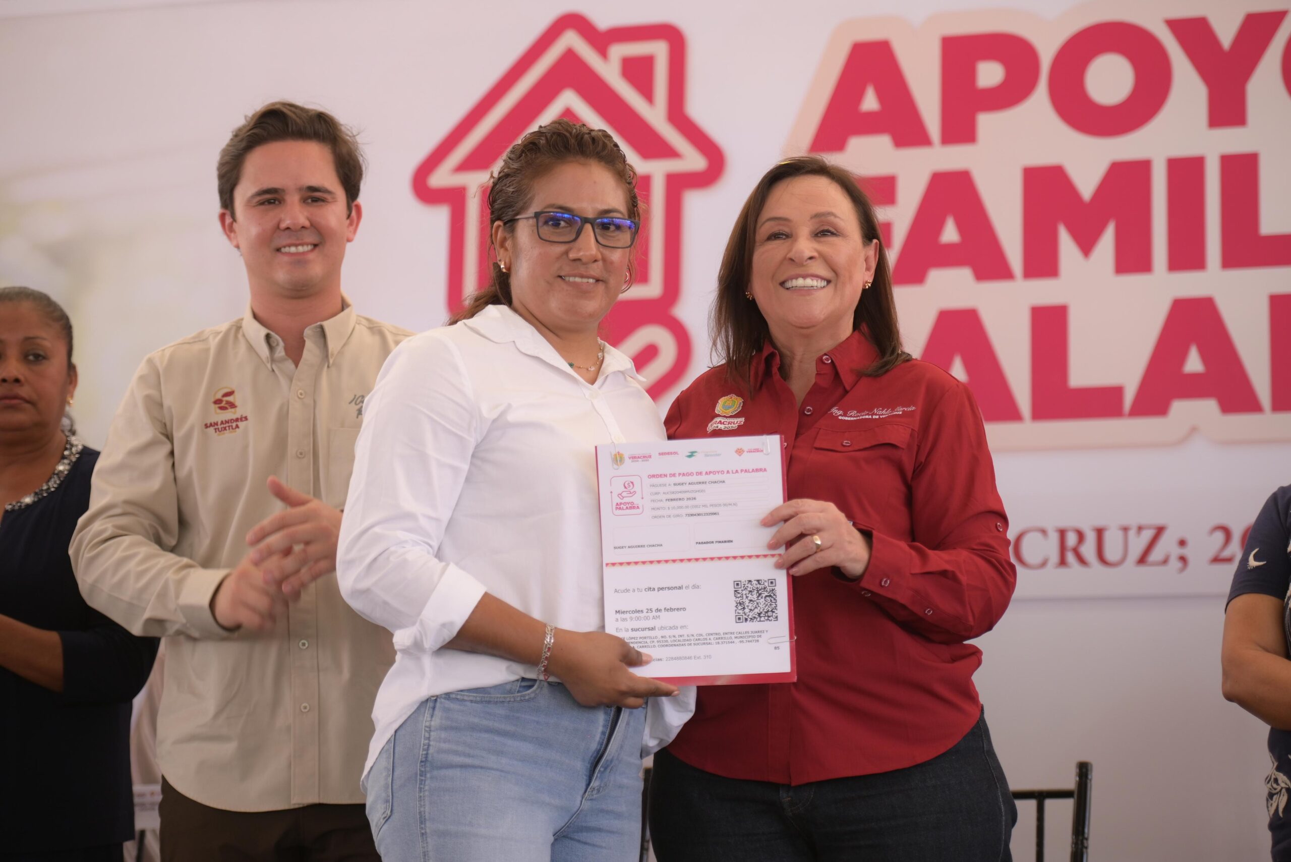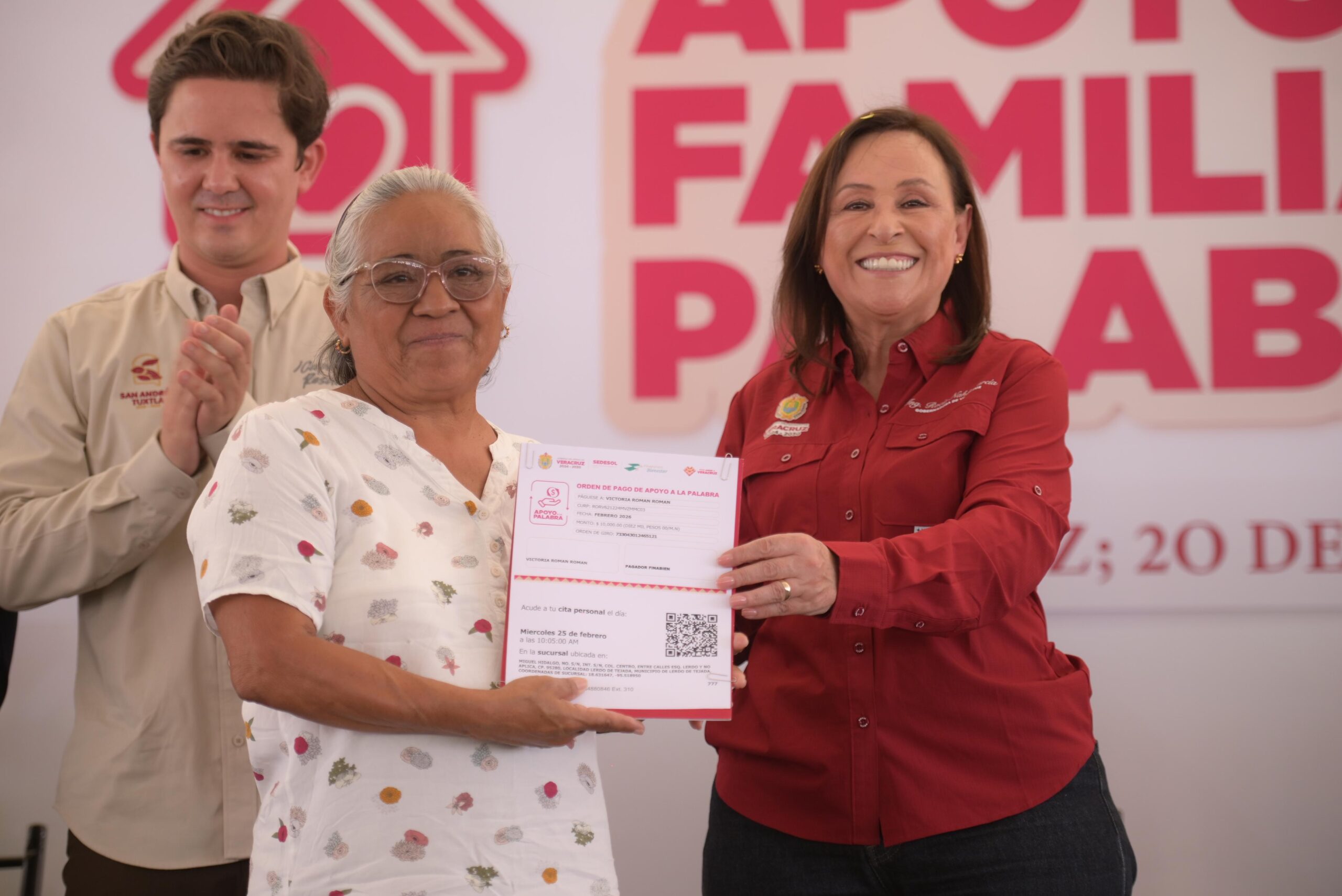 En la Unidad Deportiva ESBIO de San Andrés Tuxtla, la Mandataria encabezó el arranque y primera entrega de los programas Apoyo a la Palabra y Apoyo a la Familia, estrategia conjunta de la Secretaría de Desarrollo Social y el Sistema Estatal DIF que, en 2026, se extenderá a 112 municipios con una inversión global de 200 millones de pesos.