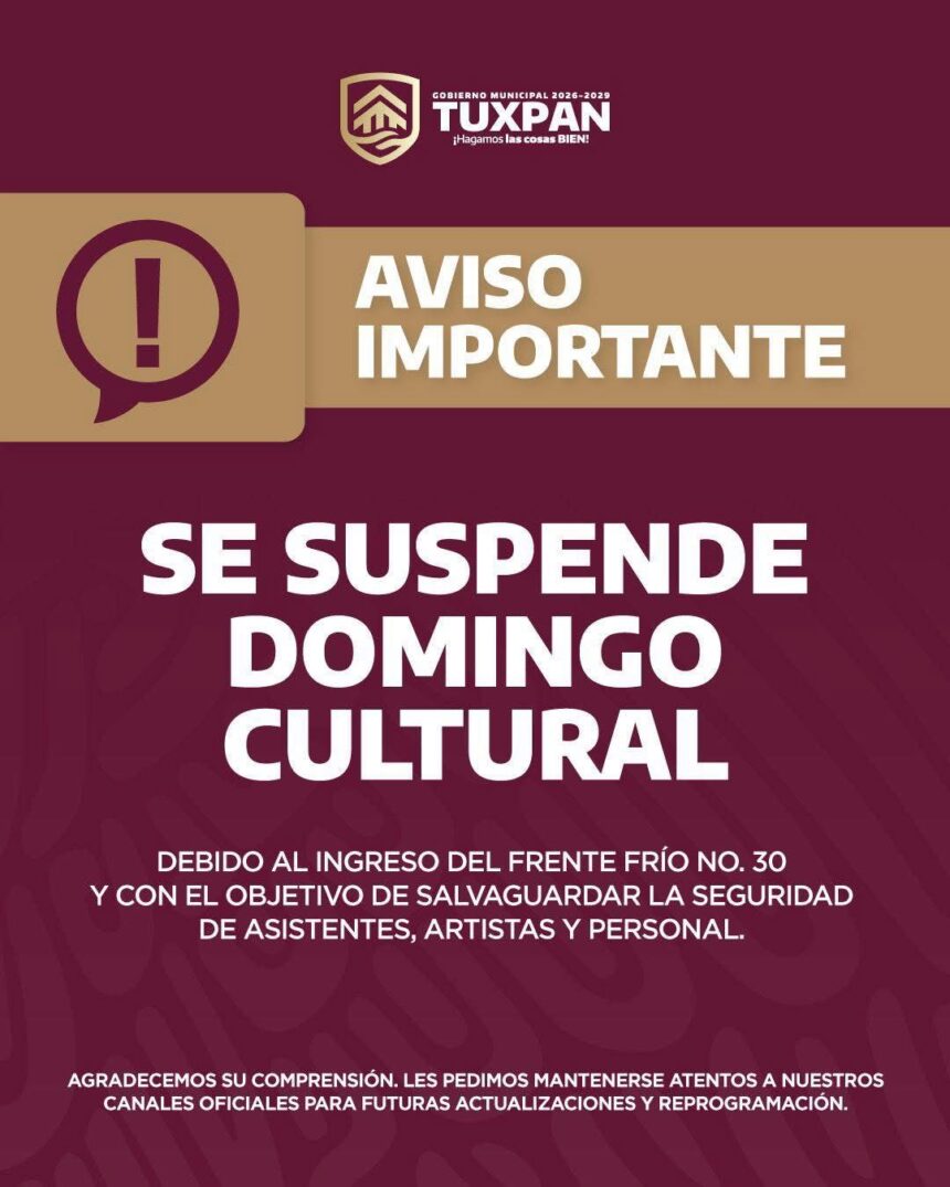Derivado del ingreso del Frente Frío No. 30, el cual traerá descenso de temperatura, rachas de viento y probabilidad de lluvias, se informa que el Domingo Cultural queda suspendido.