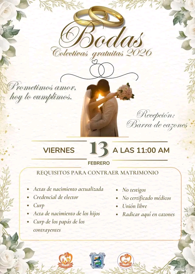 El DIF Cazones de Herrera en coordinación con el H. Ayuntamiento de Cazones, invita a todas las parejas que desean formalizar su unión a participar en las Bodas Colectivas, a través de la Dirección General del Registro Civil.