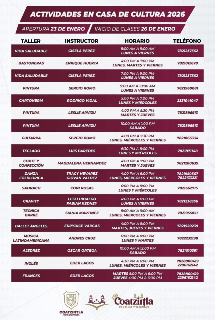 #Coatzintla, Ver. Casa de Cultura Coatzintla anunció el arranque de sus actividades 2026, con una amplia oferta de talleres dirigidos a niñas, niños, jóvenes y personas adultas.