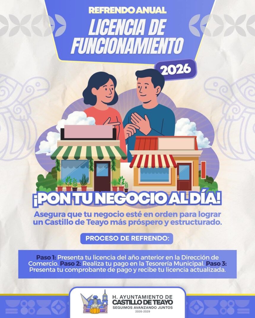 Castillo de Teayo, Ver.– El H. Ayuntamiento de Castillo de Teayo emitió un recordatorio dirigido a las y los propietarios de comercios y establecimientos para realizar el refrendo anual de la Licencia de Funcionamiento correspondiente al ejercicio 2026.