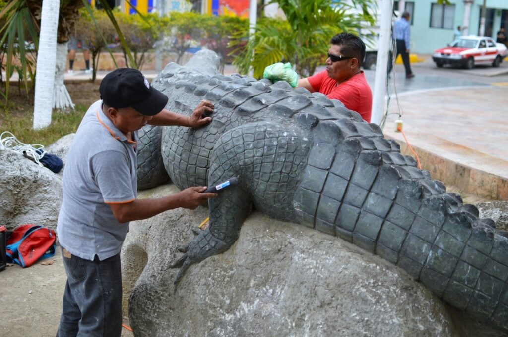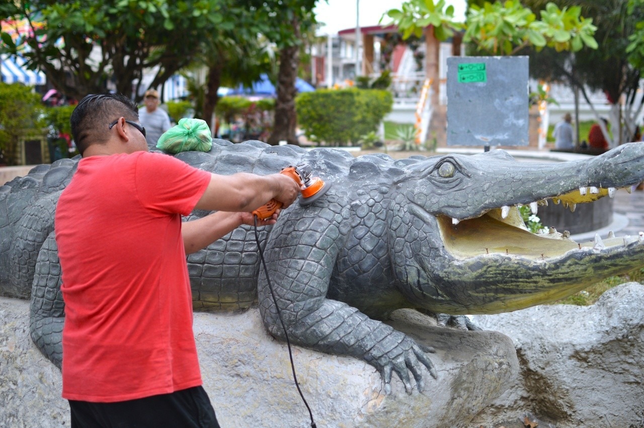 GUTIÉRREZ ZAMORA, VER.- Con la proximidad del periodo vacacional de Semana Santa, el Gobierno Municipal realiza trabajos de mantenimiento en el emblemático “cocodrilo” ubicado en el parque central, frente al Palacio Municipal, con el objetivo de mejorar la imagen urbana.
