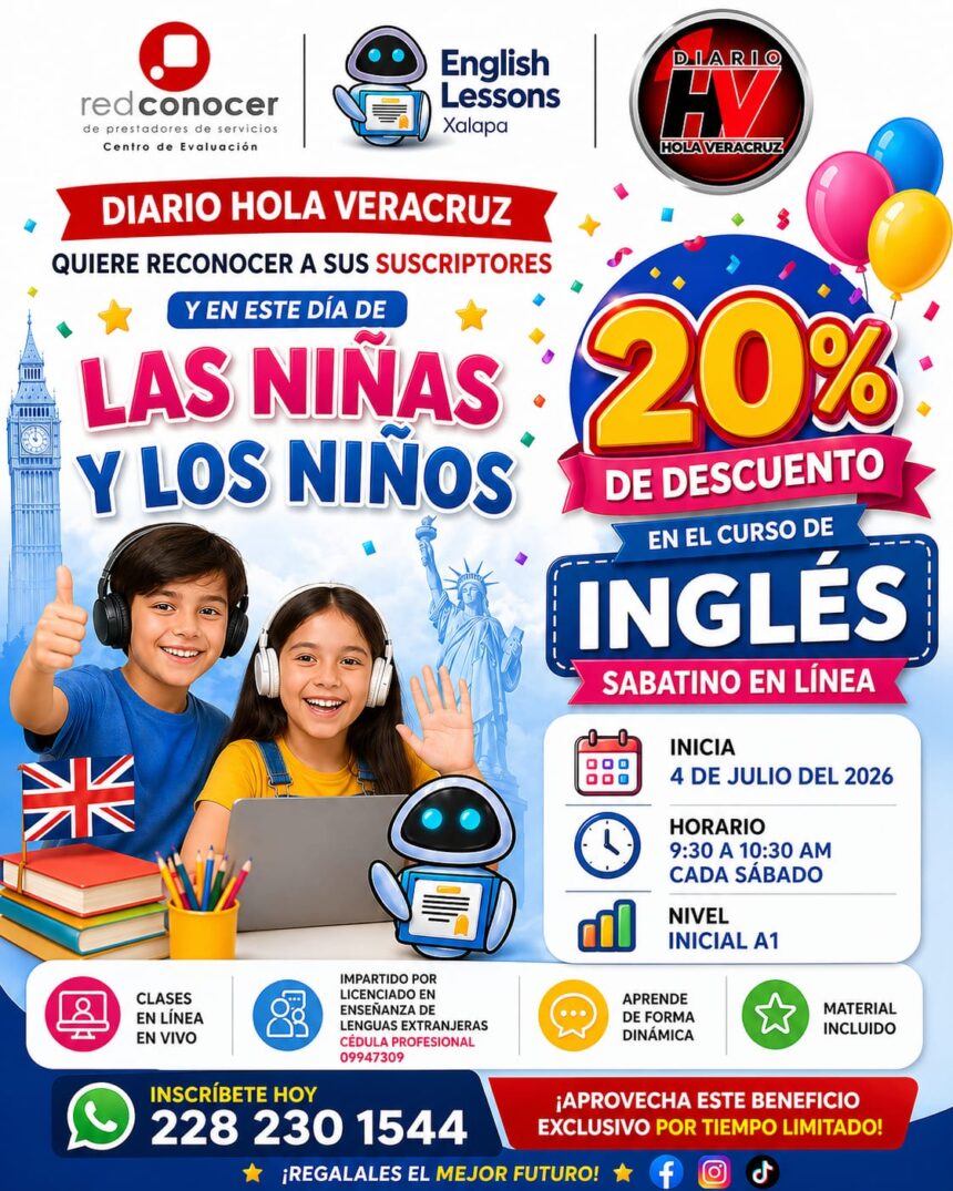 En el marco del Día de las Niñas y los Niños, del 27 al 30 de abril, quienes se inscriban al curso de inglés sabatino en línea (Nivel A1) podrán obtener un 20% de descuento en el curso anual.