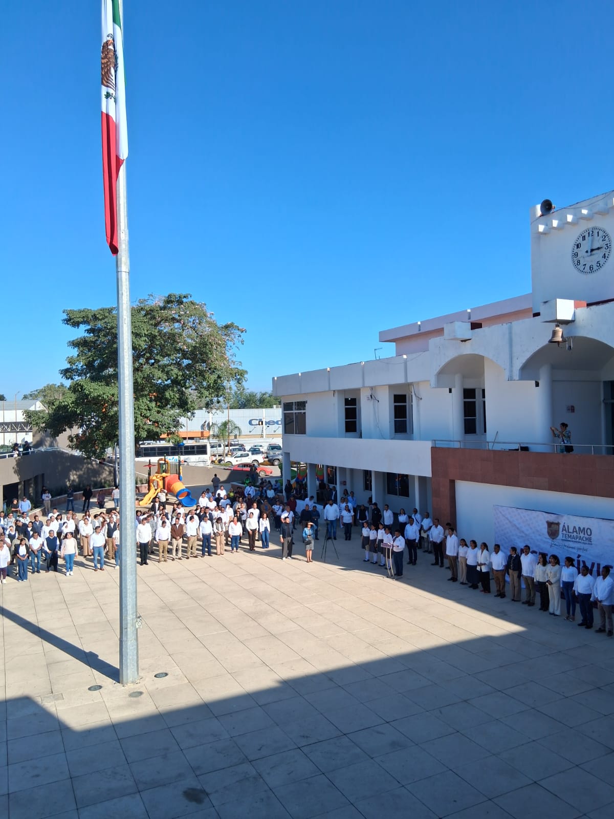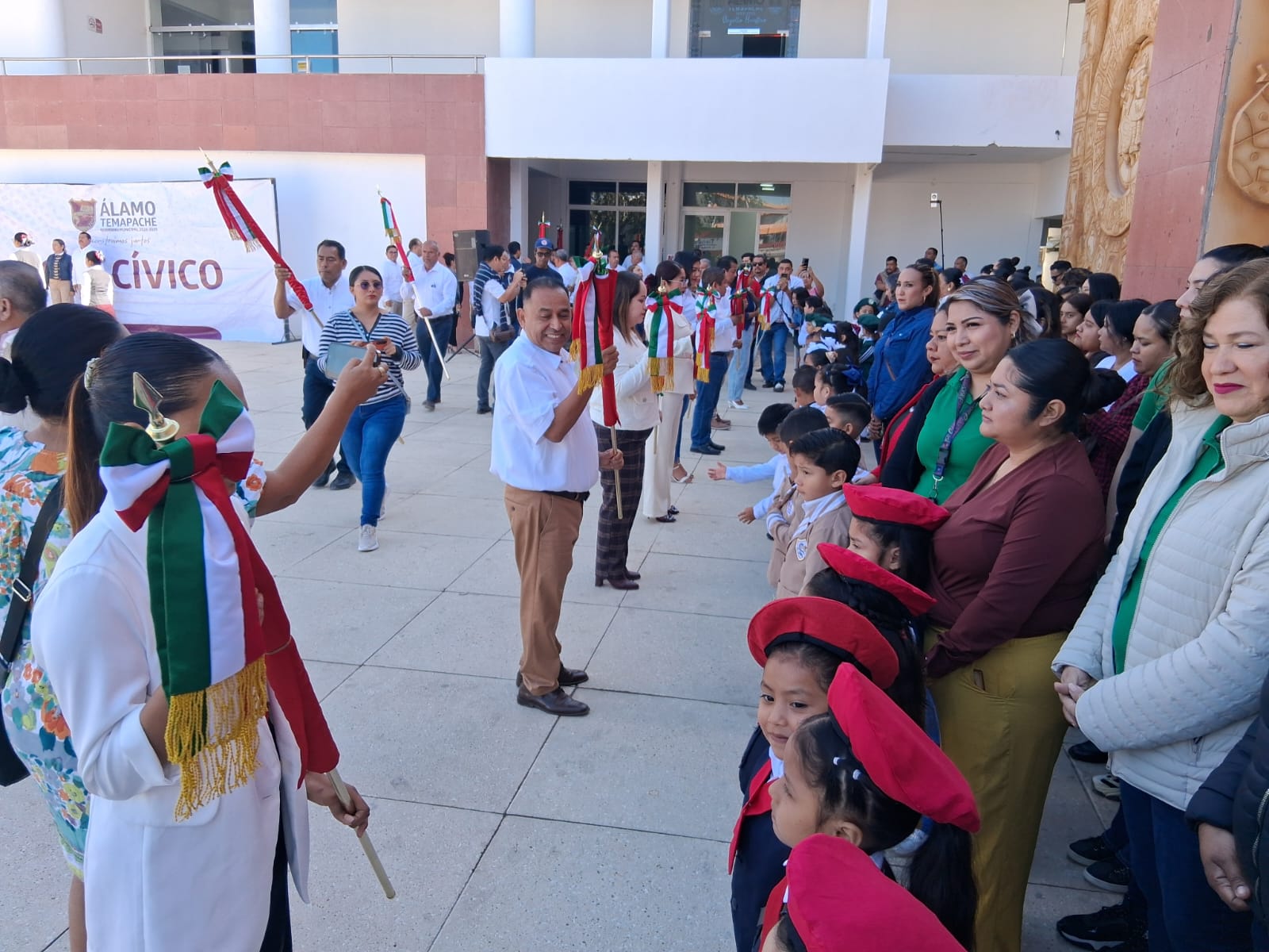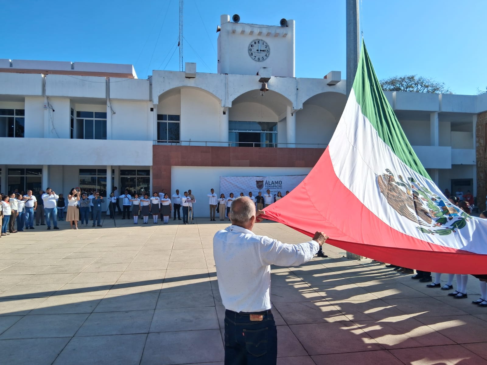 ÁLAMO, VER.– En el marco de la conmemoración del Día de la Bandera, el presidente municipal José Roberto Arenas Martínez destacó la importancia de fortalecer los valores cívicos entre la niñez y juventud alamense, al considerar que la educación y la formación en principios son fundamentales para construir un mejor futuro para el municipio.