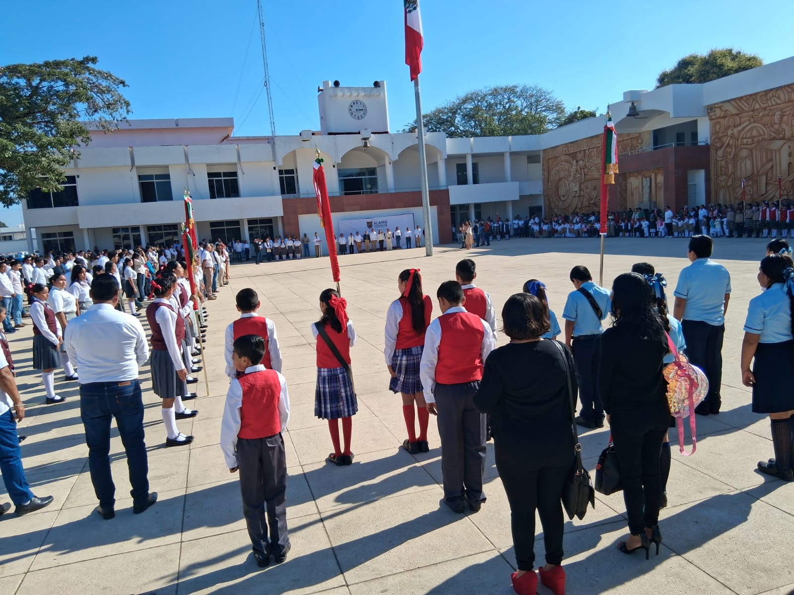 Durante la ceremonia se realizó el abanderamiento de 30 planteles educativos de todos los niveles, cuyos lábaros patrios fueron entregados por el alcalde, integrantes del Cabildo y funcionarios municipales. El acto fue organizado por directivos, docentes y estudiantes del CECyTEV Plantel 18 La Camelia, en coordinación con el Ayuntamiento.