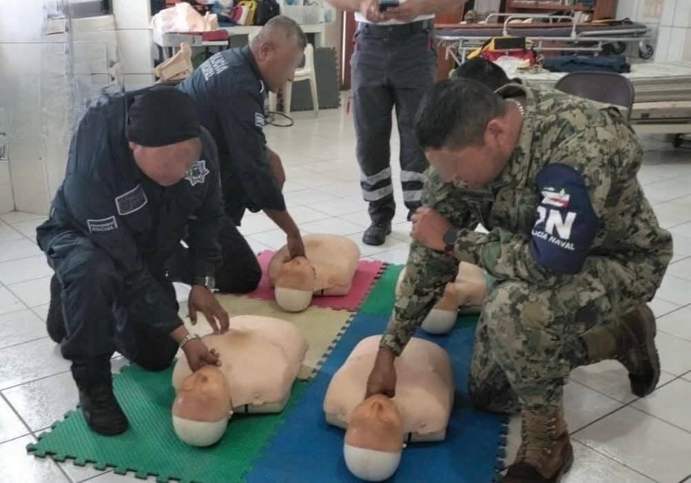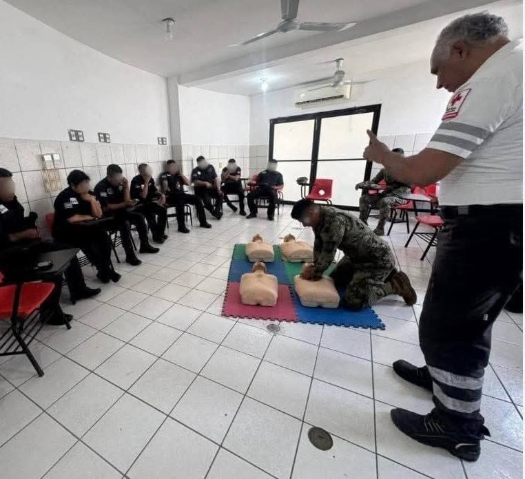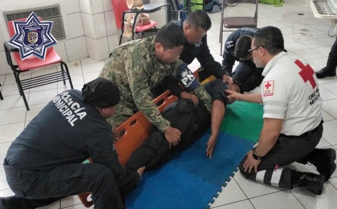 Como parte del esquema de capacitación constante para fortalecer la atención a la ciudadanía, elementos de la Policía Municipal y personal de la Secretaría de Marina (SEMAR) que brindan apoyo a la seguridad pública participaron en una jornada de prácticas de primeros auxilios impartida por personal de la Cruz Roja Delegación Tuxpan.