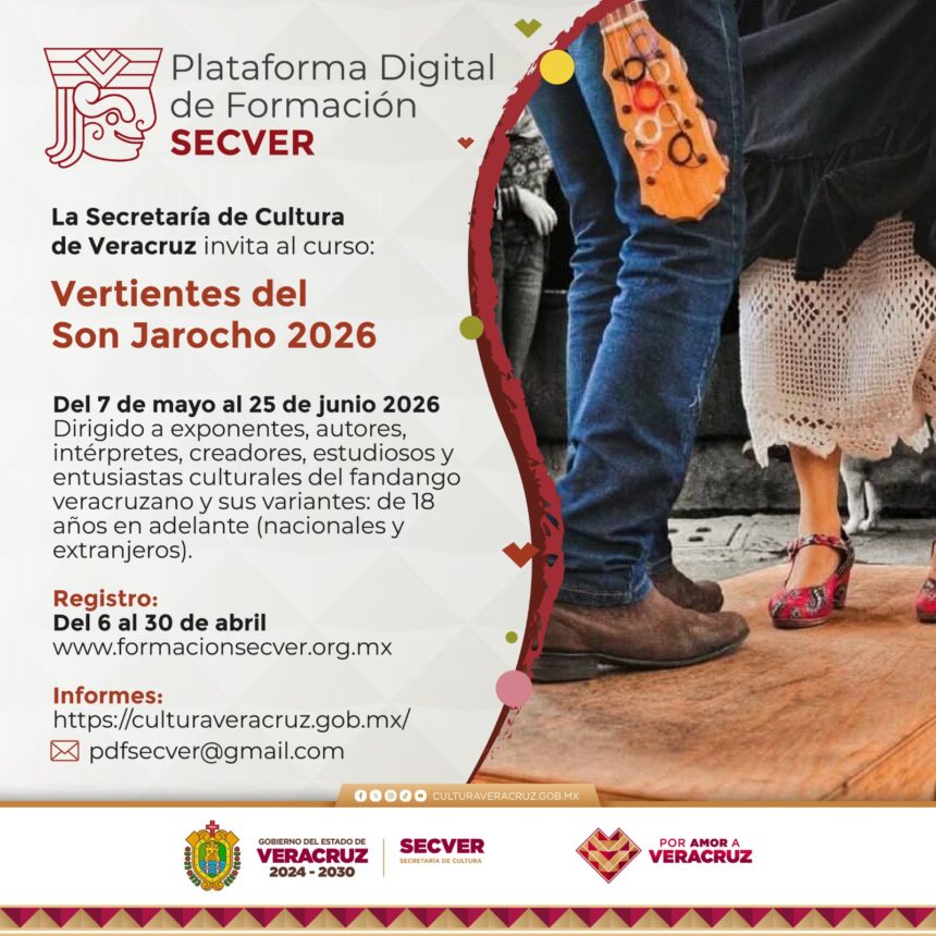 Xalapa, Ver., viernes 10 de abril de 2026.- La Secretaría de Cultura de Veracruz (SECVER) invita a participar en el Diplomado en Gestión Cultural 2026 y el curso Vertientes del Son Jarocho 2026, que se impartirán a través de la Plataforma Digital de Formación SECVER. Ambos programas requieren inscripción previa.