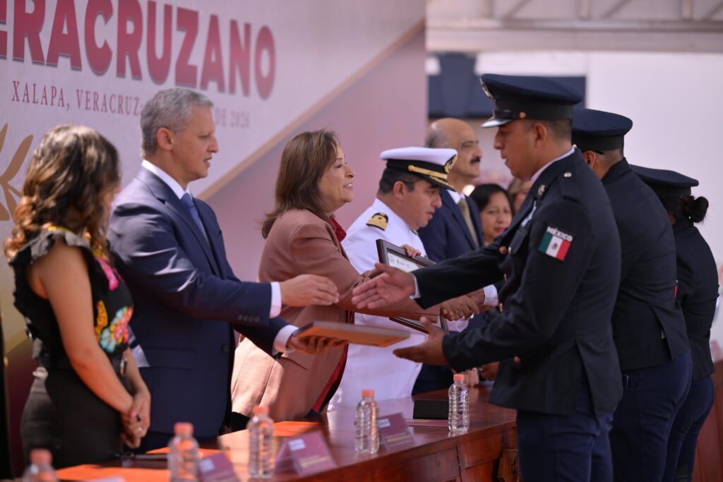 La Mandataria subrayó que el Día del Policía Veracruzano no se limita a un acto protocolario, sino que refleja el esfuerzo cotidiano de quienes sirven a Veracruz, “mi agradecimiento profundo a los policías, es un reconocimiento de un día pero realmente es el trabajo que hacen los 365 días del año”, afirmó durante la entrega de condecoraciones a diversas áreas operativas.