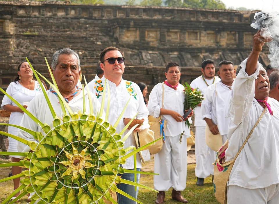 Durante la ceremonia, el presidente municipal acompañó al consejo de abuelas y abuelos en el altar mayor del Kantiyán, así como en la procesión hacia la zona arqueológica de El Tajín, donde se realizó la colocación de la ofrenda sagrada a los pies de la Pirámide de los Nichos, uno de los espacios más representativos de la cosmovisión totonaca.