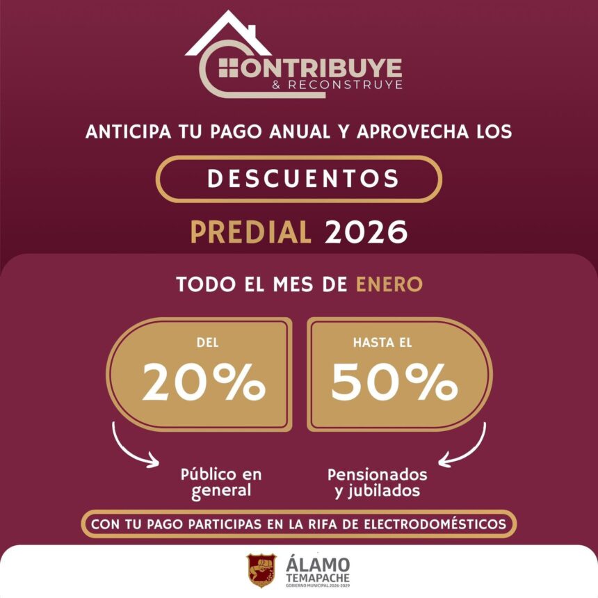 Álamo Temapache, Ver.– Con el objetivo de fortalecer las finanzas municipales y continuar con las acciones de reconstrucción y desarrollo del municipio, el Gobierno Municipal de Álamo Temapache puso en marcha el programa de descuentos en el pago del Predial 2026, vigente durante todo el mes de enero.