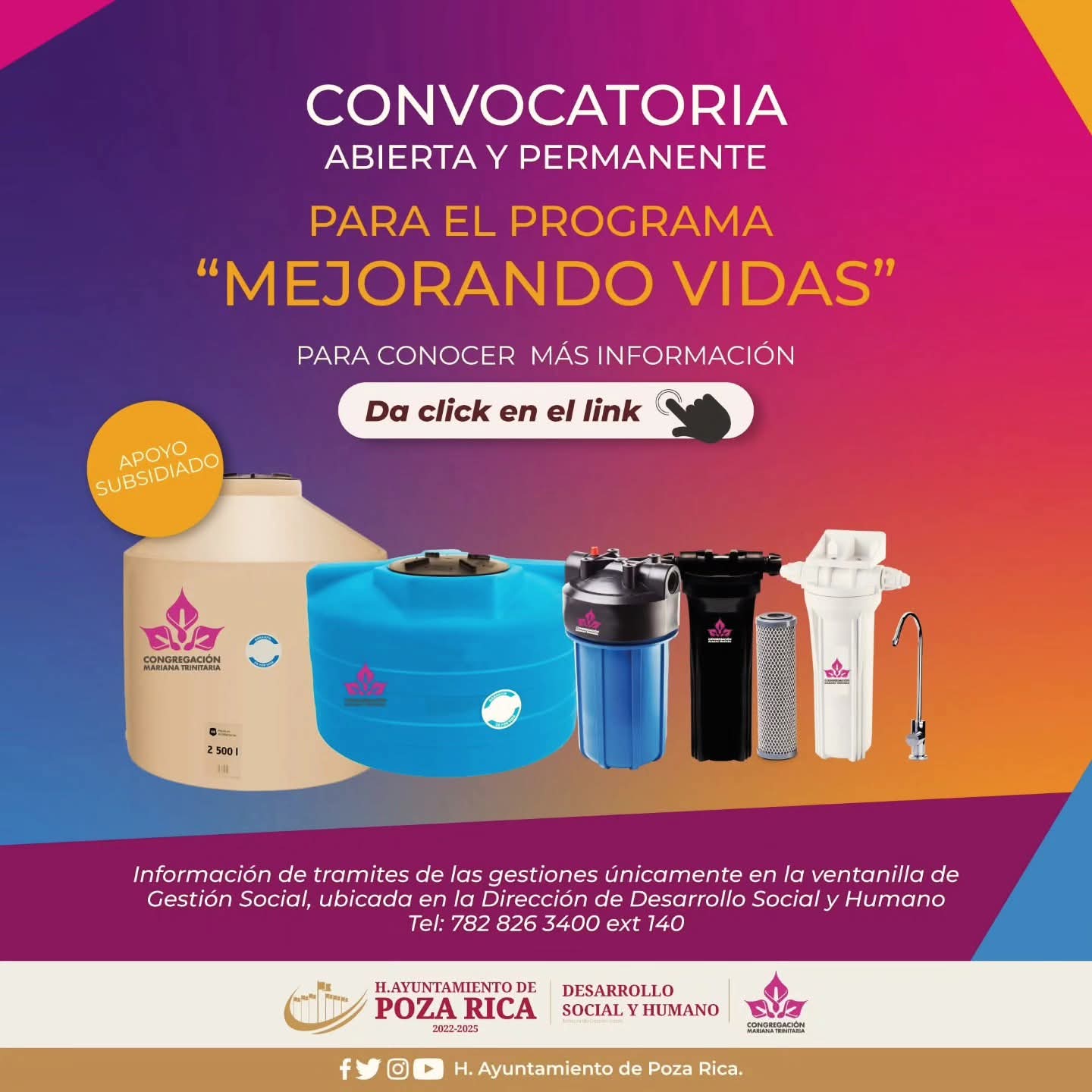 Poza Rica, Ver. – Con el propósito de contribuir al bienestar de las familias pozarricenses, el Ayuntamiento de Poza Rica, a través del Programa Municipal de Bienestar Social “Mejorando Vidas” y en coordinación con la Congregación Mariana Trinitaria, ha emitido una nueva convocatoria para la adquisición de tinacos, filtros y purificadores de agua a bajo costo.