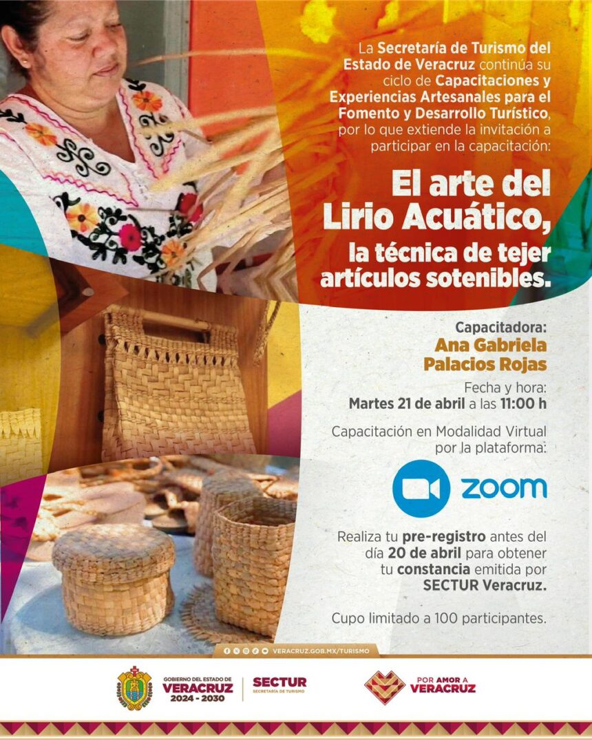 Xalapa, Ver., sábado 11 de abril de 2026.- La Secretaría de Turismo (SECTUR) invita a participar en el curso El arte del lirio acuático: técnica para tejer artículos sostenibles, que se llevará a cabo el martes 21 de abril a las 11:00 horas, como parte del ciclo Capacitaciones y experiencias artesanales para el fomento y desarrollo turístico.
