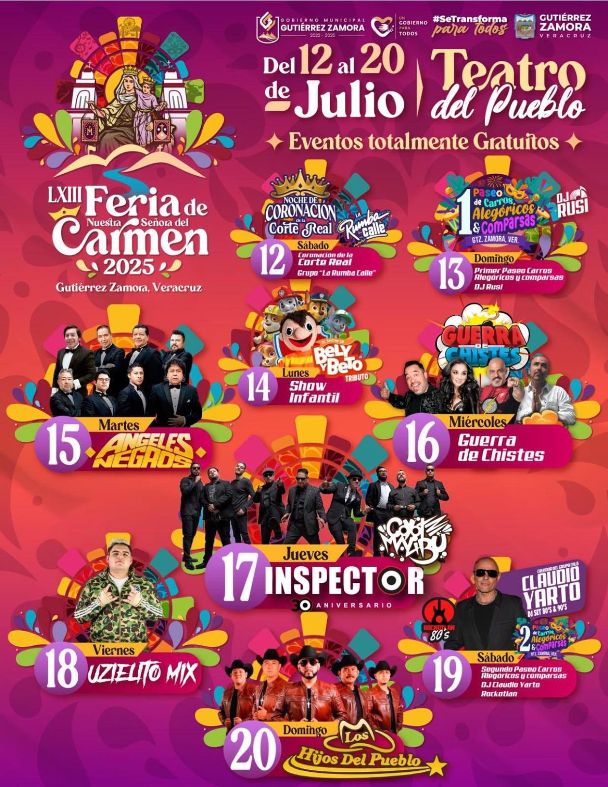 GUTIÉRREZ ZAMORA, VER.- Del 12 al 20 de julio, la población zamoreña y visitantes podrán disfrutar de la LXIII edición de la Feria de Nuestra Señora del Carmen, donde se viene preparando un extenso programa de actividades artísticas, culturales, deportivas y religiosas para el disfrute de todos los asistentes.