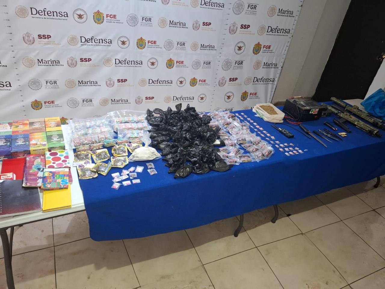Además, siete bolsitas con hierba seca con características de la marihuana, 54 bolsas con cigarros artesanales, 10 bolsitas con pastillas con la leyenda Nuevo Veracruz y 41 transparentes con la misma leyenda, nueve teléfonos celulares y dos vehículos sin reporte de robo.